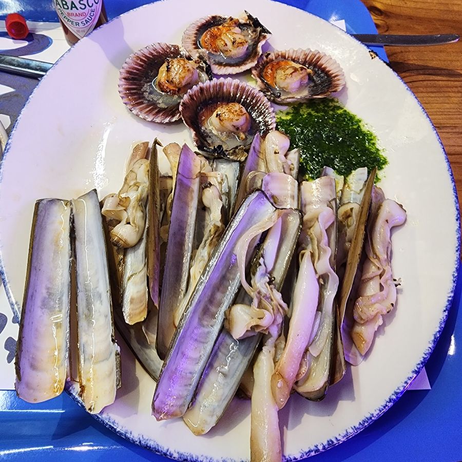 레몬즙을 살짝 뿌려 한 입 맛보니, 바다의 상큼함과 신선함이 입안 가득 퍼집니다. 이어서 나온 접시에는 길쭉한 맛조개와 조개 관자가 초록색 소스와 함께 먹음직스럽게 담겨있습니다. 알록달록한 색감이 식욕을 더욱 돋웁니다.