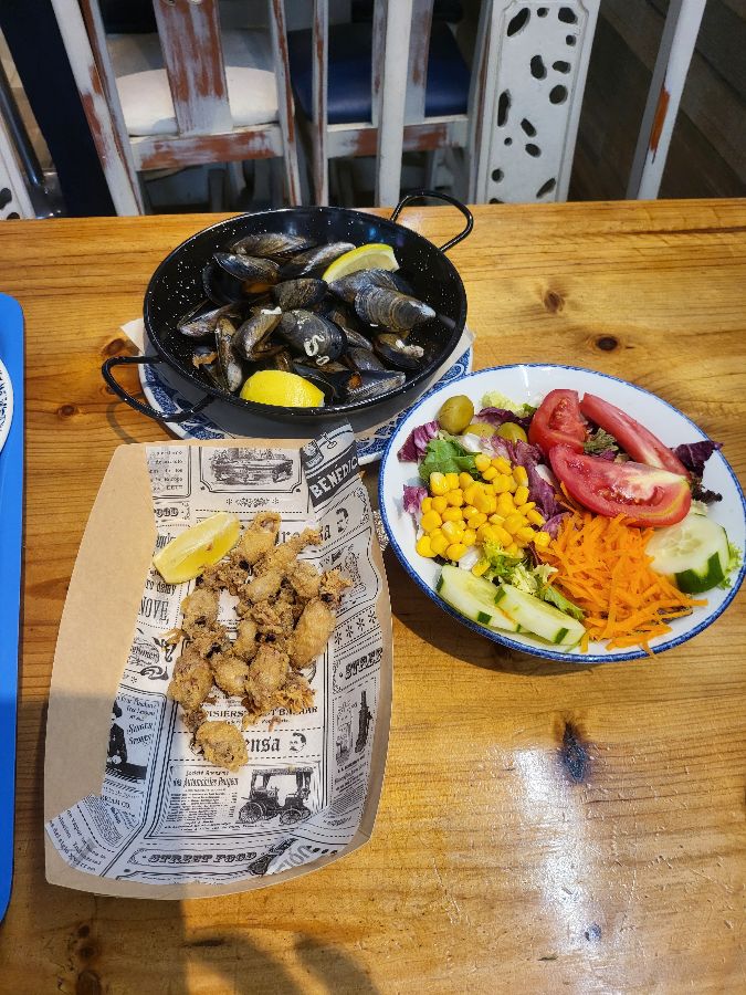 잠시 후, “메사 까또르체!” 소리와 함께 드디어 주문한 요리들이 테이블로 옮겨집니다. 파란색 트레이 위에는 갓 조리된 해산물 요리들이 푸짐하게 놓여있습니다. 먼저, 에피타이저 격으로 주문한 싱싱한 굴이 눈길을 사로잡습니다. 영롱한 빛깔의 굴은 레몬 조각과 함께 파란색 패턴의 접시에 담겨 나왔습니다.