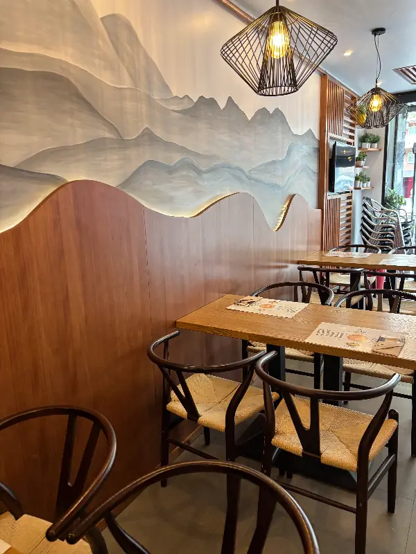 벽에는 옅은 회색조의 산수화가 그려져 있어 은은한 분위기를 더했다. 천장에 매달린 독특한 디자인의 조명은 따뜻한 빛을 발하며 공간을 아늑하게 감쌌다. 나무 소재의 테이블과 의자는 편안함을 제공했고, 전체적으로 세련된 인테리어가 돋보였다.