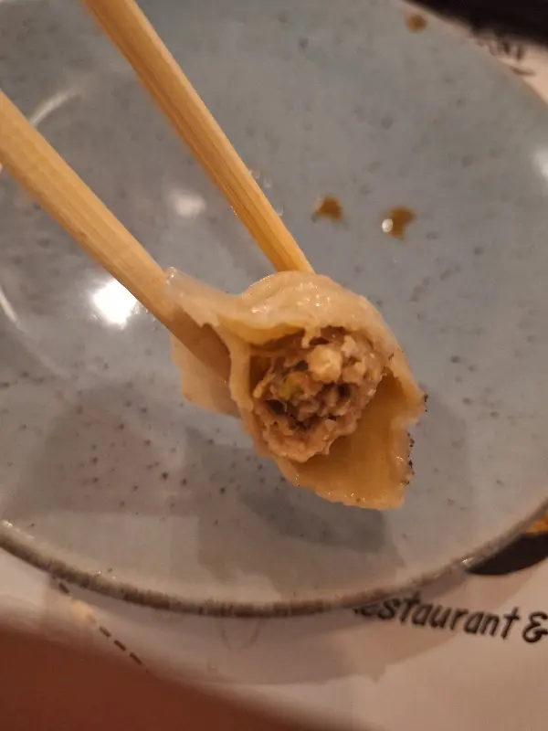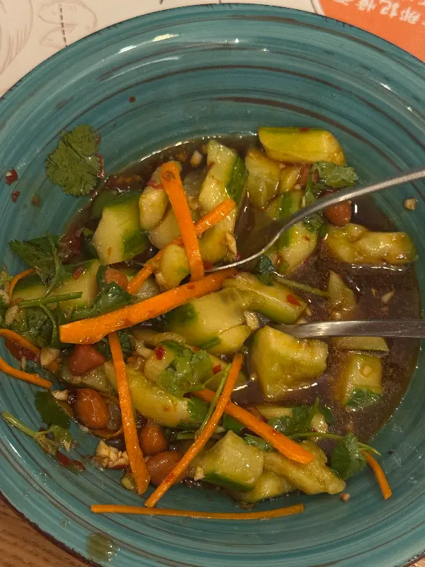 또 다른 날, 오이 샐러드와 닭고기 교자를 주문했다. 오이 샐러드는 상큼하고 신선했고, 닭고기 교자는 육즙이 풍부했다. 특히 닭고기 교자는 젓가락으로 집는 순간 육즙이 톡 터져 나와 입안 가득 퍼지는 풍미가 일품이었다.