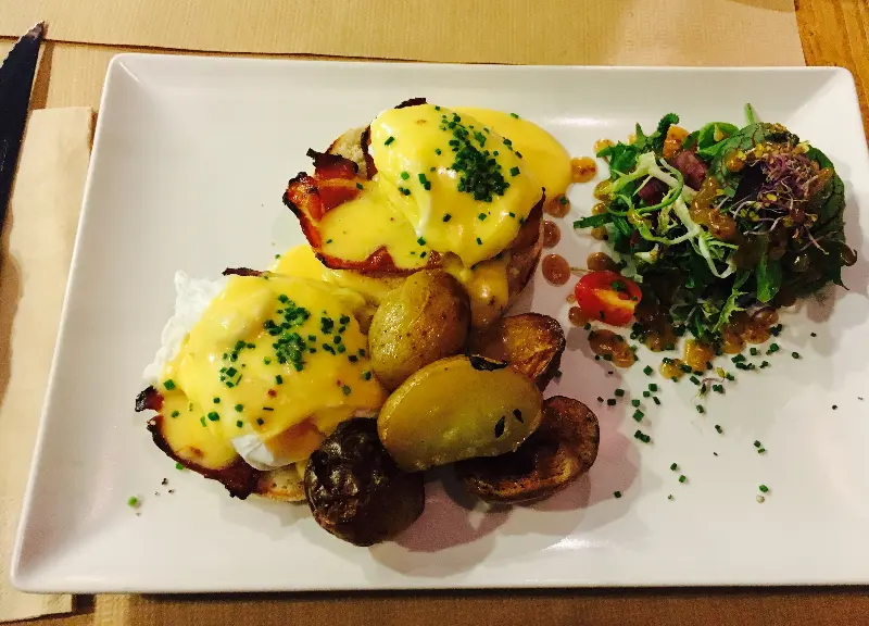 다음으로 맛본 메뉴는 바로 에그 베네딕트. 잉글리시 머핀 위에 햄(또는 살몬), 수란, 그리고 홀랜다이즈 소스가 듬뿍 뿌려진 클래식한 브런치 메뉴다.