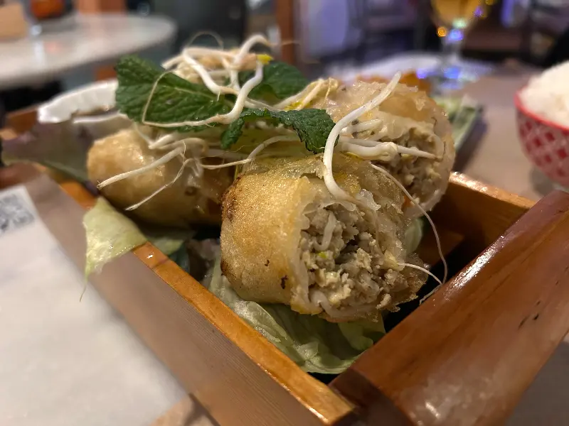 가장 먼저 나온 톰 카 카이 수프는 코코넛 밀크의 부드러움과 레몬그라스의 상큼함이 조화롭게 어우러진, 그야말로 환상적인 맛이었습니다. 한 입 맛보는 순간, 입안 가득 퍼지는 풍미에 감탄을 금치 못했죠. 닭고기의 부드러운 식감과 신선한 채소들의 아삭함이 더해져 더욱 풍성한 맛을 느낄 수 있었습니다. 따뜻한 국물은 속을 부드럽게 감싸 안아주는 듯했고, 쌀쌀한 날씨에 언 몸을 녹여주기에 충분했습니다.