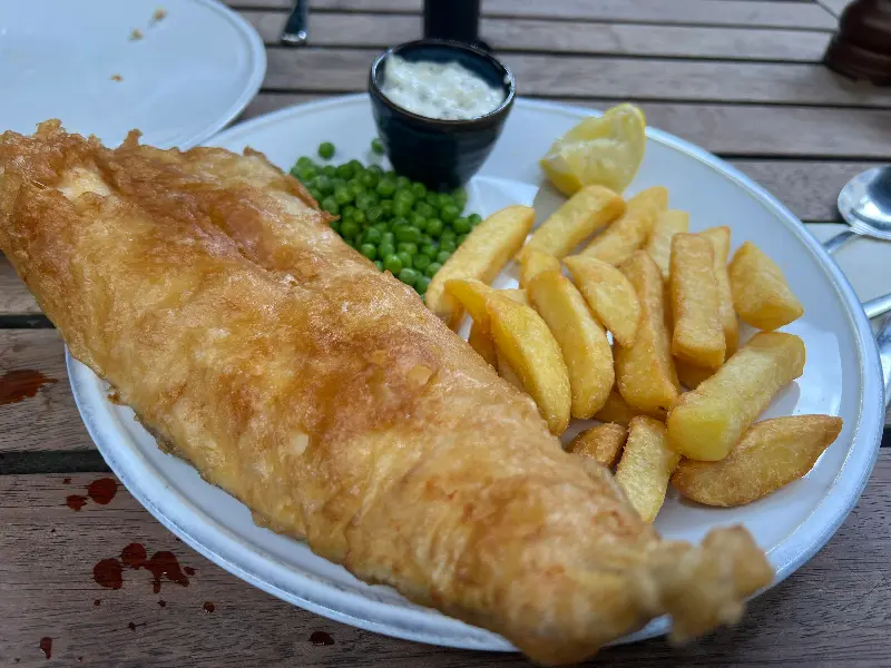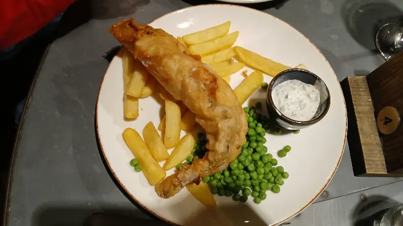 드디어 기다리고 기다리던 피쉬 앤 칩스가 나왔습니다. 큼지막한 대구 튀김과 먹음직스러운 감자튀김, 완두콩, 타르타르 소스가 한 접시에 담겨 나왔습니다. 겉은 바삭하고 속은 촉촉한 대구 튀김은 정말 환상적이었습니다. 신선한 생선을 사용해서인지 비린 맛은 전혀 없고, 담백하면서도 고소한 맛이 입안 가득 퍼졌습니다.