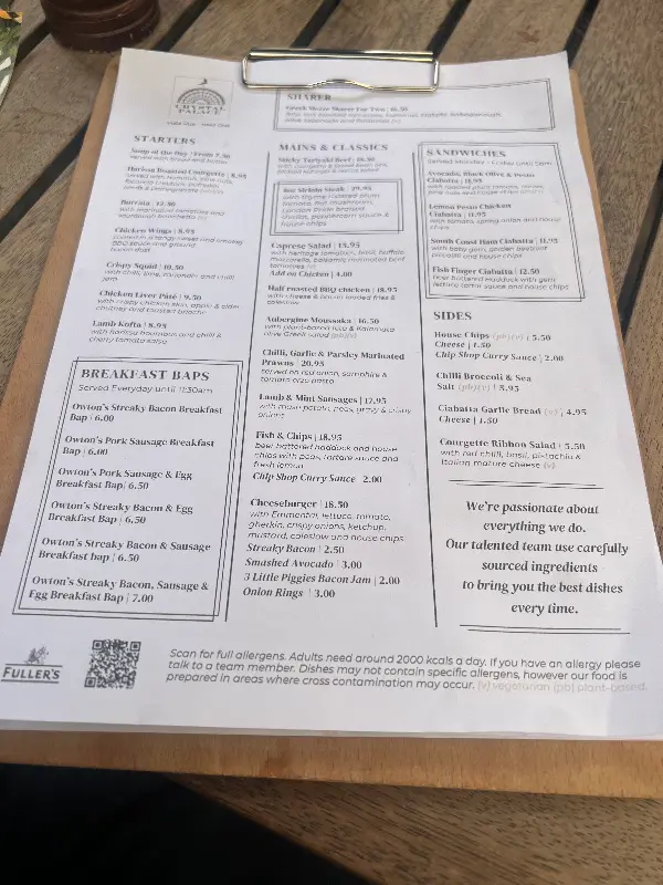 메뉴판을 펼쳐 들자 다양한 음식들이 눈에 들어왔습니다. 스타터부터 메인 요리, 샌드위치까지, 선택의 폭이 넓어 좋았습니다. 잠시 고민 끝에 크리스털 팰리스의 대표 메뉴인 피쉬 앤 칩스와 오늘의 수프를 주문했습니다.