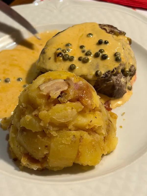 뿐만 아니라, 겉은 바삭하고 속은 촉촉한 스테이크 위에 뿌려진 녹진한 소스는 혀를 감싸는 듯한 풍미를 선사한다. 테이블에 놓인 하얀 접시 위에서 윤기를 뽐내는 스테이크는 시각적인 만족감 또한 높여준다.