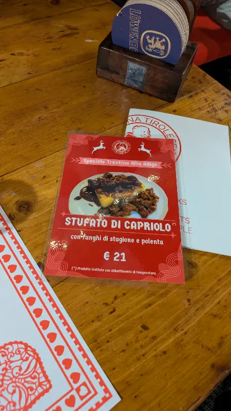 이곳의 음식은 한마디로 ‘푸짐하고 따뜻하며 소박한 맛’이다. 티롤 지방의 전통 요리를 맛볼 수 있다는 점이 가장 큰 매력이다. 메뉴를 살펴보면, 버섯 수프, 비엔나 슈니첼, 체바프치치 등 다양한 요리가 준비되어 있다. 특히 버섯 수프는 많은 방문객들이 극찬하는 메뉴 중 하나이다.