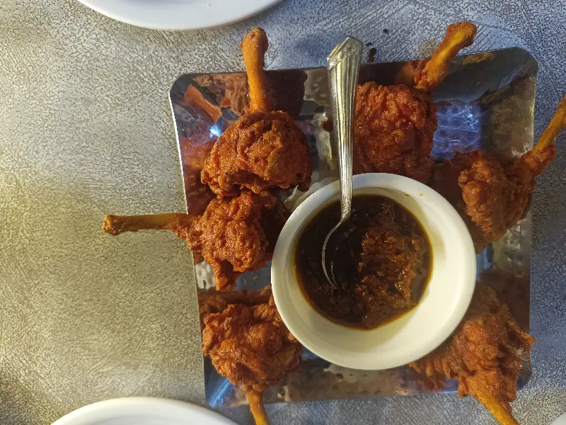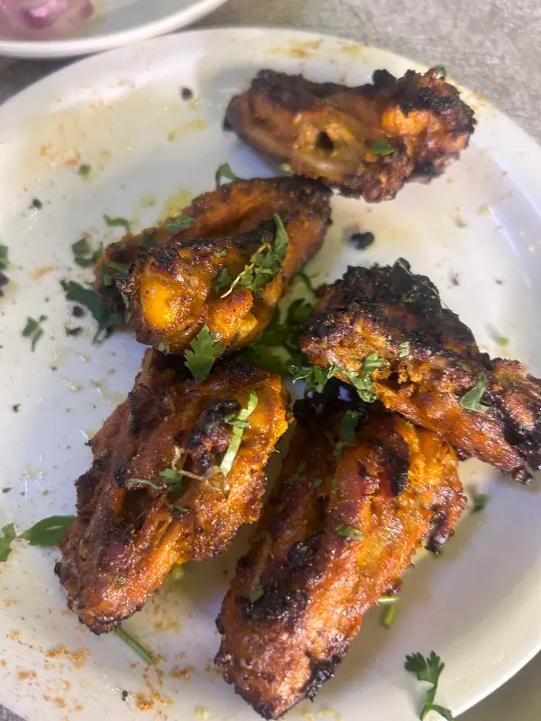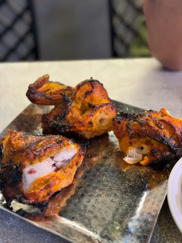 자리에 앉자마자 메뉴판을 펼쳐 들었다. 다양한 탄두리 요리와 해산물 메뉴들이 눈길을 사로잡았다. 치킨 탄두리, 새우튀김, 버터치킨… 고민 끝에 가장 먼저 탄두리 치킨 반 마리를 주문했다. 잠시 후, 테이블 위로 김이 모락모락 피어오르는 탄두리 치킨이 놓였다. 겉은 바삭하고 속은 촉촉한 완벽한 조화! 붉은 빛깔을 뽐내는 치킨 위에는 신선한 허브가 뿌려져 있어, 향긋한 풍미를 더했다. 한 입 베어 무니, 입안 가득 퍼지는 풍부한 향신료의 향과 육즙이 황홀경을 선사했다.