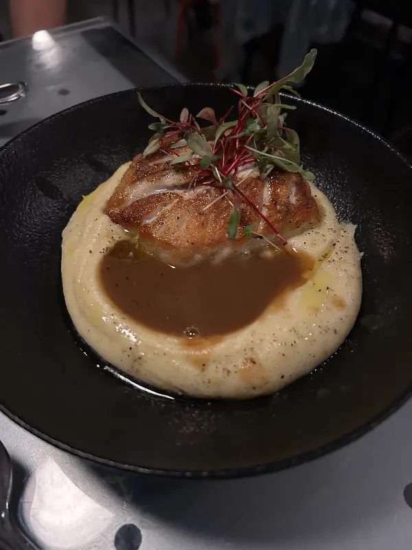 가장 먼저 등장한 것은 ‘오늘의 생선’ 요리였다. 검은색 접시 위에는 마치 예술 작품처럼 아름다운 음식이 놓여 있었다. 윤기가 자르르 흐르는 생선살 위에는 신선한 허브가 흩뿌려져 있었고, 그 아래에는 부드러운 크림이 깔려 있었다. 한 입 맛보니, 입안 가득 퍼지는 신선한 생선의 풍미와 고소한 크림의 조화가 환상적이었다. 특히 생선 특유의 비린 맛은 전혀 느껴지지 않았고, 오히려 은은한 단맛이 감돌았다. 직원의 설명처럼, 재료의 신선함이 그대로 느껴지는 맛이었다.