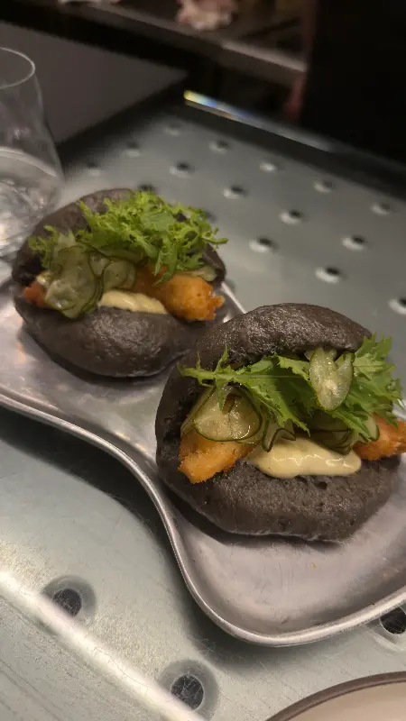 다음으로 맛본 것은 ‘몬타디토’였다. 숯처럼 검은색 빵 안에 튀긴 생선과 채소가 들어간 독특한 비주얼의 몬타디토는 눈으로 보기에도 즐거움을 선사했다. 빵은 겉은 바삭하고 속은 촉촉했으며, 튀긴 생선은 바삭하면서도 부드러웠다. 특히 와사비 마요네즈 소스는 자칫 느끼할 수 있는 맛을 잡아주면서, 톡 쏘는 매력적인 풍미를 더했다. 친구는 와사비 마요네즈가 조금 강하다고 했지만, 개인적으로는 아주 만족스러웠다.