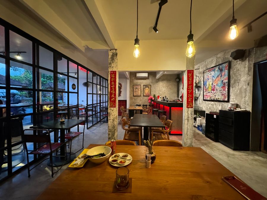 회색빛 콘크리트 벽면과 따뜻한 우드 톤 가구, 그리고 천장에 길게 늘어뜨려진 에디슨 전구들이 조화롭게 어우러져 편안하면서도 세련된 분위기를 연출합니다. 창밖으로 살랑이는 발리의 풍경이 액자처럼 걸려 있고, 곳곳에 걸린 붉은색 중국 전통 장식들이 이국적인 멋을 더합니다. 붉은 네온사인이 은은하게 빛나는 바 공간은 저녁 시간에 더욱 매혹적인 분위기를 선사할 듯했죠. 첫 방문의 설렘은 친절한 직원의 따뜻한 미소와 함께 더욱 깊어졌습니다.