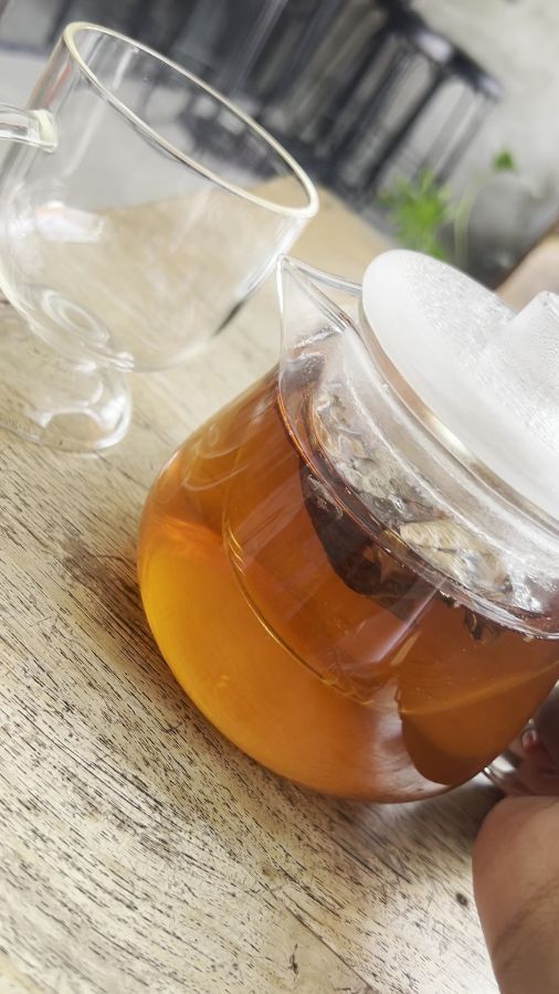 자리에 앉자마자 따뜻한 차 한 잔이 먼저 나왔습니다. 투명한 유리 주전자에 담긴 호박색 차는 은은한 향을 풍기며 마음을 차분하게 가라앉혔습니다. 바깥 풍경을 바라보며 한 모금 마시니, 여행의 피로가 사르르 녹아내리는 듯했죠. 이어서 식욕을 돋우는 시원한 음료도 함께 준비되어 완벽한 시작을 알렸습니다.