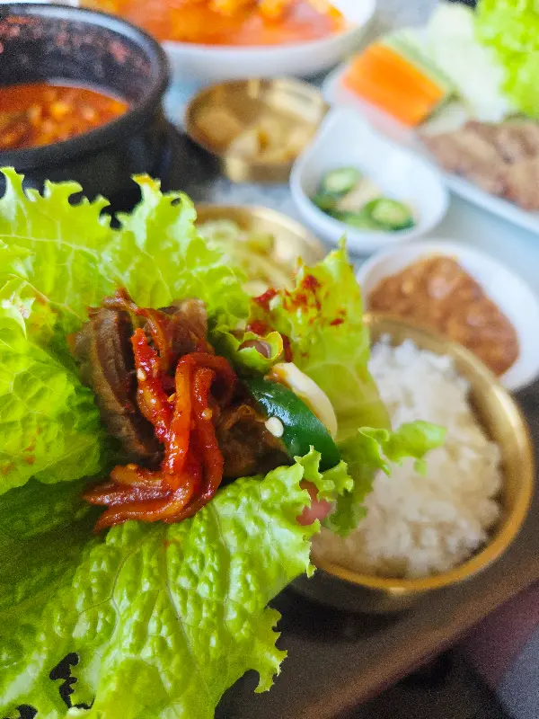사장님께 여쭤보니, 매일 아침 직접 시장에서 공수해오는 채소들이라고 한다. “손님들에게 신선하고 건강한 음식을 제공하고 싶다”는 사장님의 진심이 느껴지는 대목이었다. 쌈 채소 외에도 직접 담근 김치와 깍두기, 콩나물무침 등 정갈한 밑반찬들이 식탁을 풍성하게 채워주었다.