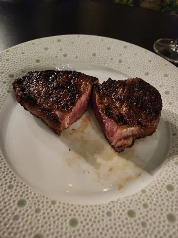 스테이크는 완벽한 익힘 정도를 자랑했습니다. 겉은 바삭하게 시어링 되어 육즙을 가두고, 속은 촉촉하고 부드러웠습니다. 특히 센스 있는 직원 덕분에 두 가지 소스를 곁들여 먹을 수 있었는데, 스테이크의 풍미를 더욱 다채롭게 즐길 수 있었습니다. 첫 번째 소스는 클래식한 스테이크 소스로, 깊고 진한 맛이 스테이크의 풍미를 더욱 돋보이게 했습니다. 두 번째 소스는 허브를 넣어 만든 상큼한 소스로, 스테이크의 느끼함을 잡아주면서 입안을 산뜻하게 만들어주었습니다.