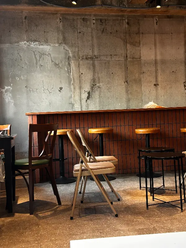 가게 안으로 들어서니, 몇 개의 테이블이 놓인 아담한 공간이 눈에 들어왔습니다. 벽면은 차가운 콘크리트 질감으로 마감되어 있었지만, 나무 소재의 테이블과 의자가 따뜻함을 더했습니다.