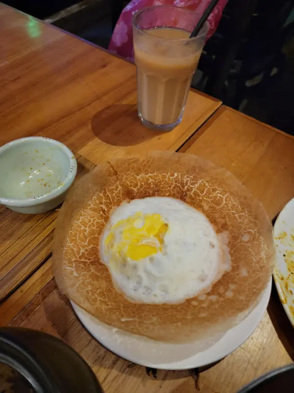 아팜은 랑카 스타일의 팬케이크로, 겉은 바삭하고 속은 쫄깃한 식감이 특징이다. 하지만 바삭함이 금방 사라지니, 나오자마자 바로 먹는 것이 좋다. 따뜻할 때 먹으면 더욱 맛있게 즐길 수 있다.