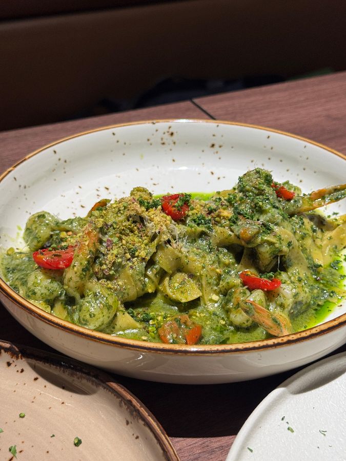 신선한 바질 페스토가 듬뿍 올라간 파스타는 향긋한 풍미를 자랑합니다.