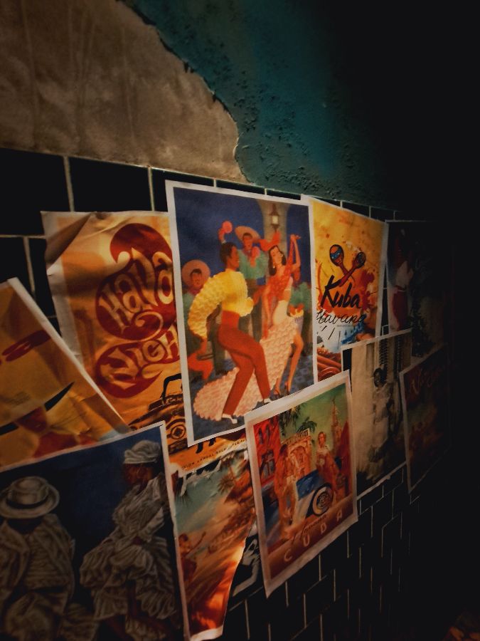 강렬한 색감과 역동적인 쿠바의 모습을 담은 빈티지 포스터들이 벽면을 가득 채우고 있습니다.