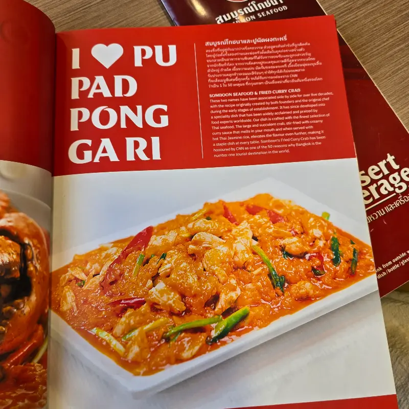 직원들은 매우 친절했는데, 주문한 맥주를 직접 따라주는 세심한 서비스에 감동받았다. 마치 고급 레스토랑에 온 듯한 기분이었다. 메뉴판을 펼쳐 들고 고민에 빠졌다. 쏨분 씨푸드의 대표 메뉴인 푸팟퐁커리를 비롯해 다양한 해산물 요리들이 눈길을 사로잡았다.