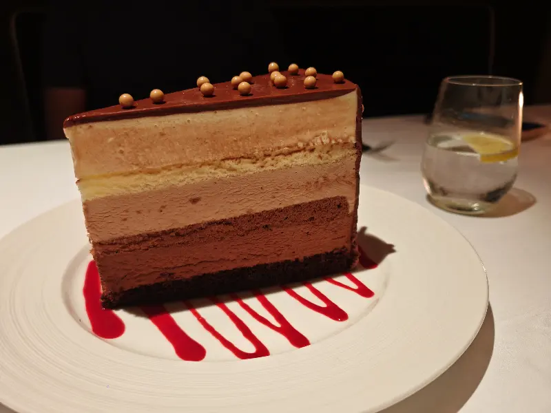 식사를 마치고 디저트로 초콜릿 케이크를 주문했다. 거대한 크기에 놀랐지만, 달콤한 향에 이끌려 한 입 맛보니, 진한 초콜릿 맛이 입 안 가득 퍼졌다. 촉촉하고 부드러운 식감 또한 훌륭했다. 한 조각만으로도 충분히 만족스러운 디저트였다.