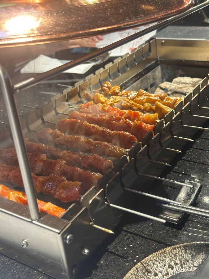 문을 열고 들어서자, 가장 먼저 눈에 띄는 것은 테이블마다 설치된 자동 회전 꼬치 그릴입니다. 빙글빙글 돌아가는 꼬치들을 보고 있자니 마치 작은 축제에 온 듯한 설렘이 느껴집니다. 은은하게 풍겨오는 숯불 향은 코를 간지럽히며 식욕을 자극합니다. 한 리뷰어는 이곳을 “타협 없는 가게”라고 표현했는데, 그만큼 퀄리티에 대한 자부심이 느껴집니다.