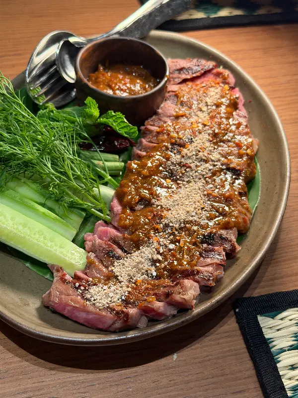 소고기 슬라이스는 부드러운 육질과 매콤한 소스가 완벽한 조화를 이루었습니다. 신선한 오이와 향긋한 허브를 곁들여 먹으니, 입안 가득 퍼지는 풍미가 일품이었습니다. 쌈을 싸 먹으니 더욱 다채로운 맛을 즐길 수 있었습니다.