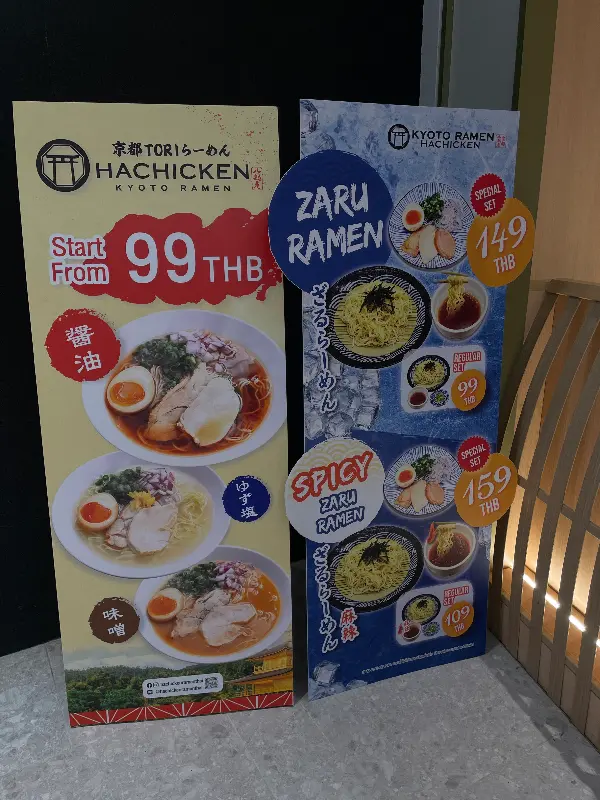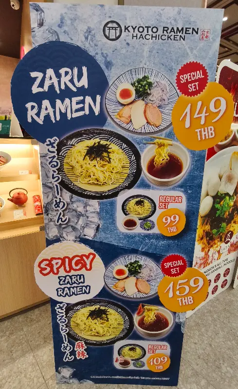 가게 앞에 놓인 메뉴판을 살펴보면, Zaru Ramen과 Spicy Zaru Ramen이 시선을 사로잡습니다. 각각 149바트와 159바트의 특별 세트 메뉴는 푸짐한 한 끼 식사를 제공합니다. 99바트와 109바트의 일반 세트도 준비되어 있어, 가벼운 식사를 원하는 사람들에게 안성맞춤입니다. 이처럼 다양한 가격대의 메뉴는 고객의 선택 폭을 넓혀줍니다.
