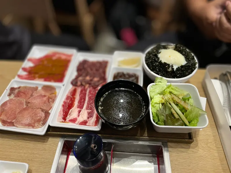 메뉴를 살펴보니, 소고기와 돼지고기를 함께 즐길 수 있는 세트 메뉴와 단품 메뉴가 다양하게 준비되어 있었다. 고민 끝에 트리오 세트를 주문했다. 잠시 후, 눈 앞에 펼쳐진 화려한 비주얼에 감탄했다. 신선한 고기와 함께 된장국, 김치 또는 샐러드를 선택할 수 있어 완벽한 한 끼 식사를 즐길 수 있다. 밥 양도 100g 또는 200g 중에서 선택 가능하며, 사이드 메뉴는 아쉽게도 리필은 불가능하다.