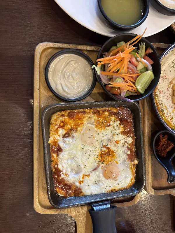 다음은 샤크슈카. 토마토 소스의 깊은 풍미와 은은한 매콤함이 완벽하게 어우러진 요리였다. 특히 반숙으로 익혀진 계란 노른자를 톡 터뜨려 소스와 함께 먹으니, 그 고소함과 부드러움이 입안 가득 퍼져 나갔다. 샤크슈카는 마치 따뜻한 햇살처럼, 온몸을 부드럽게 감싸 안아주는 듯한 느낌이었다.