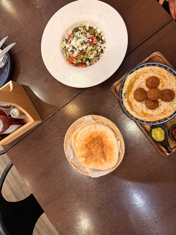 나는 식사 공간으로 발걸음을 옮겼다. 깨끗하고 쾌적한 공간은 편안한 분위기를 자아냈고, 테이블에 앉아 메뉴판을 펼쳐 들었다. 샐러드, 파스타, 피자, 샌드위치 등 다양한 메뉴들이 눈에 들어왔지만, 나의 선택은 이미 정해져 있었다. 바로 이곳의 대표 메뉴인 후무스와 샤크슈카, 그리고 팔라펠이었다.
