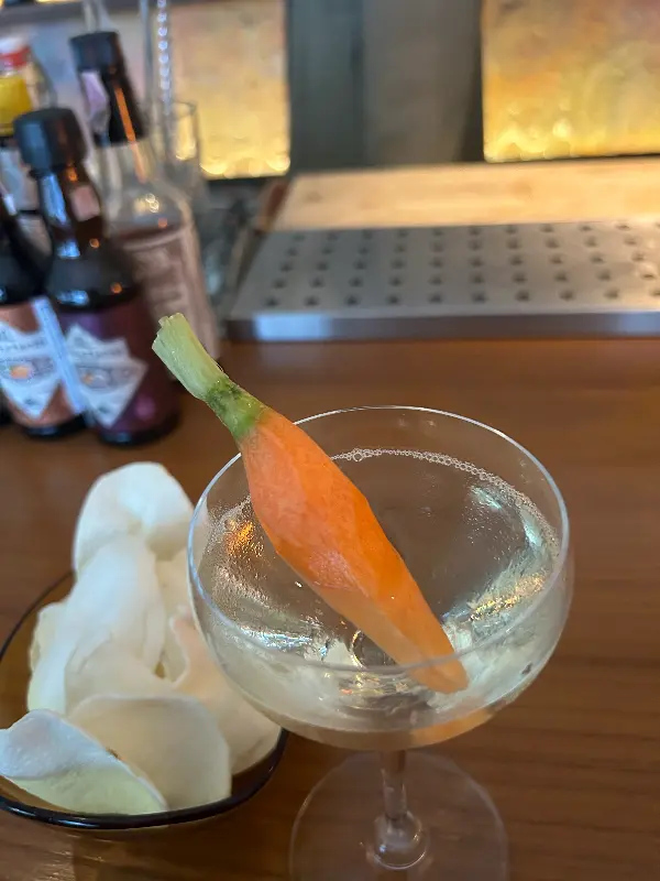 특히 당근이 통째로 들어간 칵테일은 TRUE Bar의 위트와 개성을 보여주는 대표적인 메뉴입니다. 신선한 당근의 향긋함과 칵테일의 조화는 예상외의 즐거운 경험을 선사합니다. 5번 메뉴는 카카오와 바닐라 향이 은은하게 느껴지면서도 새콤한 레몬 맛이 강렬하게 다가오는 독특한 칵테일입니다. 칵테일 위에는 커다란 당근이 꽂혀 있어 시각적인 즐거움까지 더합니다.