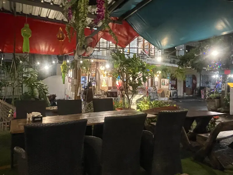 드디어 숙소에 도착해 짐을 풀고 나니, 슬슬 배가 고파지기 시작했다. 태국에서의 첫 끼니, 아무거나 먹을 수는 없지. 숙소 바로 옆에 있다는 쌈센센터(Samsen Center), 이름부터가 뭔가 끌리는 이 곳으로 발걸음을 옮겼다. 문을 열자, 은은한 조명과 함께 흘러나오는 감미로운 기타 선율이 나를 반겼다. 마치 오래된 친구를 만난 듯, 편안하고 따뜻한 기운이 온몸을 감쌌다.