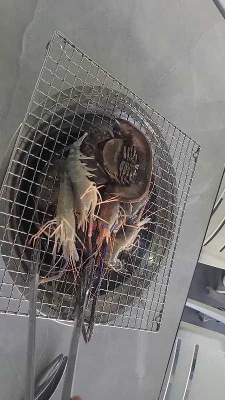 자리를 잡고 본격적으로 해산물 사냥에 나섰다. 큼지막한 새우와 쫄깃한 조개를 듬뿍 담아 테이블로 돌아왔다. 숯불 위에 석쇠를 올리고, 해산물을 하나씩 올려 구워지기를 기다렸다. 지글지글 익어가는 소리와 함께 코를 찌르는 고소한 냄새가 식욕을 자극했다.