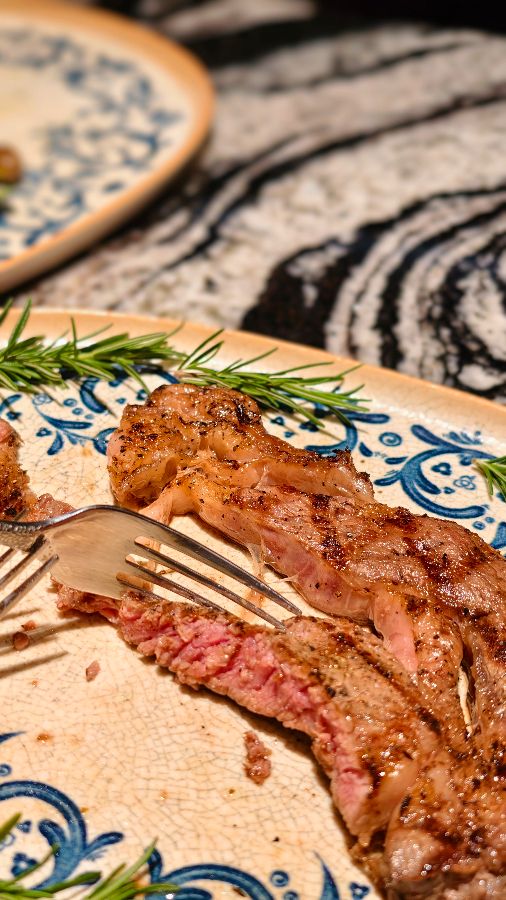 Ox & Embers의 진정한 하이라이트는 단연 스테이크입니다. 이곳의 스테이크는 조스퍼 그릴에서 완벽하게 구워져 나오며, 조리 과정을 직접 볼 수 있다는 점도 흥미롭습니다. 뜨거운 불꽃 위에서 육즙을 가두며 지글거리는 소고기를 보는 것은 그 자체로 하나의 퍼포먼스이자 식욕을 자극하는 경험입니다.