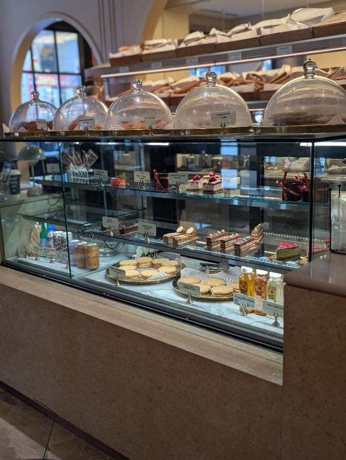 창밖으로는 밴쿠버의 거리가 펼쳐지고, 따뜻한 햇살이 창을 통해 스며들어 공간에 활기를 더합니다. 특히 쇼케이스에는 먹음직스러운 타르트와 조각 케이크, 쿠키 등이 가지런히 진열되어 있어 눈으로 먼저 맛보는 즐거움을 선사합니다. 투명한 덮개 아래 놓인 다양한 디저트들은 마치 보석처럼 빛나며 방문객들의 시선을 사로잡습니다. 이곳의 인테리어는 빵의 맛을 더욱 돋보이게 하는 하나의 예술 작품이라 할 수 있습니다.