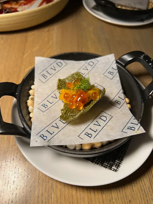 해산물 타워는 블러바드 키친에서 꼭 맛봐야 할 메뉴 중 하나입니다. 신선한 굴, 새우, 가리비 등 다양한 해산물을 한 번에 즐길 수 있는 해산물 타워는 2인분이지만 4명이서 애피타이저로 나눠 먹기에도 충분합니다. 특히, 구운 굴은 풍미가 좋고 양념이 잘 되어 있어, 해초와 성게의 조합은 마치 바다의 정수를 담은 듯한 느낌을 선사합니다.
