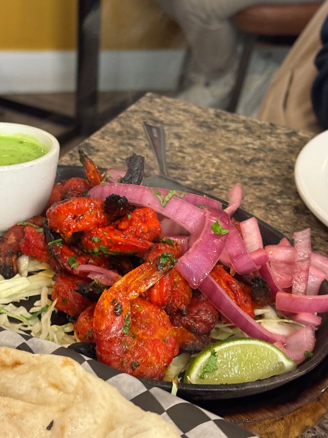 새빨간 양념에 먹음직스럽게 구워진 탄두리 새우(Tandoori Prawns)는 또 어떻고요. 뜨거운 팬 위에 지글거리며 올라오는 새우는 그 빛깔만으로도 침샘을 자극합니다. 라임 한 조각을 뿌려 새콤함을 더하고, 붉은 양파와 함께 맛보면 탱글탱글한 새우 살의 식감과 매콤하면서도 깊은 양념의 맛이 완벽하게 어우러집니다.