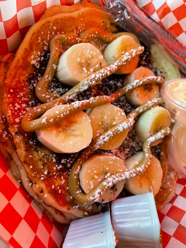 팬케이크 위에 바나나 슬라이스와 시럽, 슈가 파우더를 듬뿍 뿌린 달콤한 비주얼은 눈과 입을 모두 즐겁게 합니다.