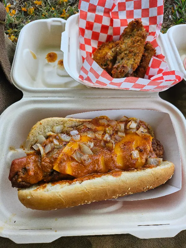 칠리소스와 양파, 치즈가 듬뿍 올려진 핫도그와 바삭한 튀김은 Veggietize Me에서 즐길 수 있는 또 다른 별미입니다.