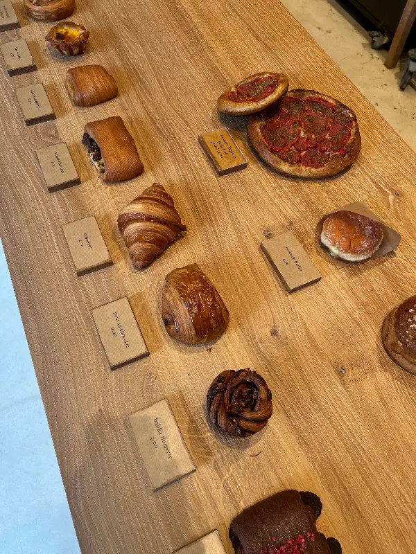 따뜻한 미소로 맞이하는 직원들의 친절함은 빵 맛을 더욱 기대하게 만들었다. 진열대 위에는 윤기가 흐르는 크루아상, 뺑 오 쇼콜라, 쇼송 오 폼므 등 다채로운 페이스트리들이 저마다의 아름다움을 뽐내고 있었다. 나무 테이블 위에 정갈하게 놓인 빵들은 그 자체로 예술 작품처럼 보였다.
