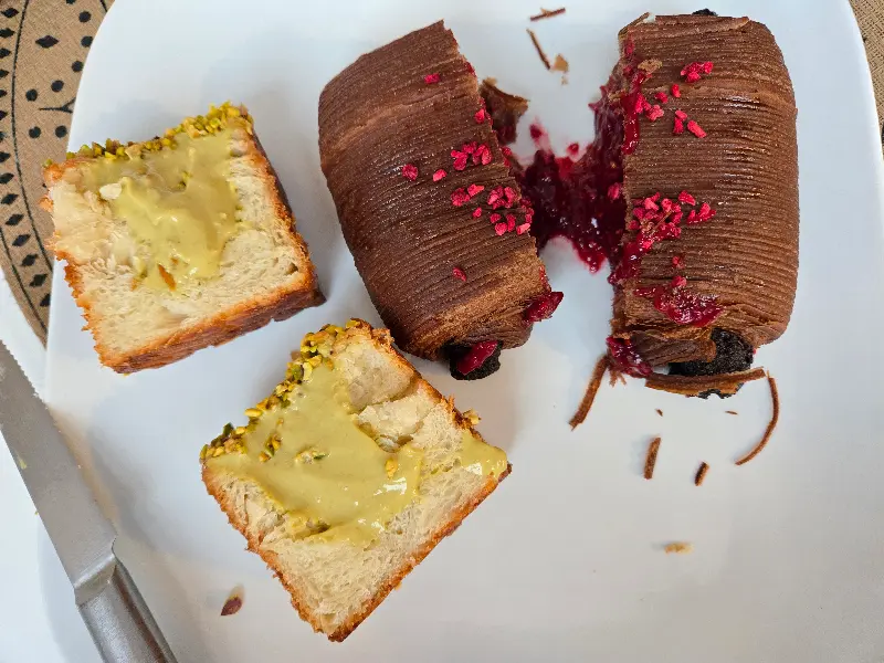 특히 인상 깊었던 것은 코코아 프람부아즈 페이스트리였다. 다크 초콜릿의 깊은 풍미와 라즈베리 잼의 상큼함이 환상적인 조화를 이루며 입안 가득 행복을 선사했다. 너무 예뻐서 먹기 아까울 정도였지만, 한 입 맛보는 순간 그 맛에 매료되어 멈출 수 없었다.
