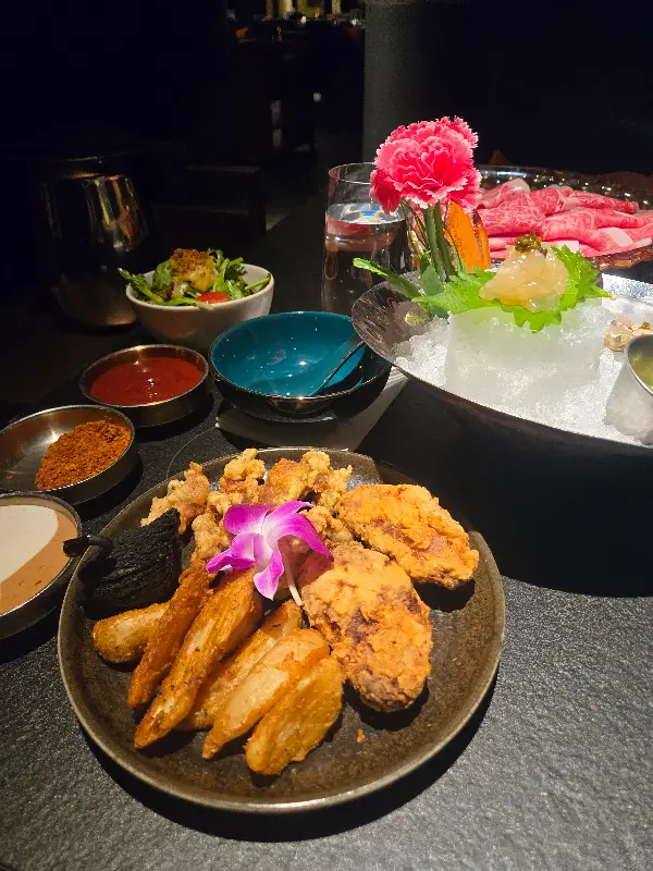 The X Pot의 가장 큰 매력은 단연 훠궈입니다. 이곳에서는 신선한 해산물과 최상급 소고기를 비롯한 다양한 재료를 맛볼 수 있습니다. 특히 “고기는 부드럽고 입에서 살살 녹고, 해산물은 신선하다”는 평처럼, 재료의 퀄리티는 의심할 여지가 없습니다. 이미지에서 보이는 마블링이 촘촘하게 박힌 소고기는 그 자체로 예술 작품과 같습니다. 얇게 슬라이스된 소고기를 뜨거운 육수에 살짝 담갔다가 입에 넣으면, 그 부드러움과 풍부한 육즙에 감탄하게 됩니다.