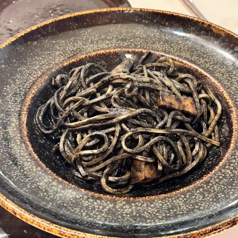 피자 외에도 먹물 파스타도 판매하고 있었습니다. 비록 다른 분들의 후기에서는 평범하다는 평가가 있었지만, 저는 색다른 메뉴에 도전해보고 싶었습니다. 검은색 면이 인상적인 먹물 파스타는 독특한 비주얼을 자랑했습니다.