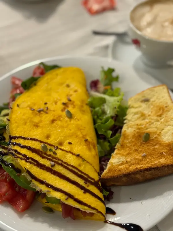 신선한 샐러드와 함께 제공되는 오믈렛, 건강한 한 끼 식사로 제격이다.