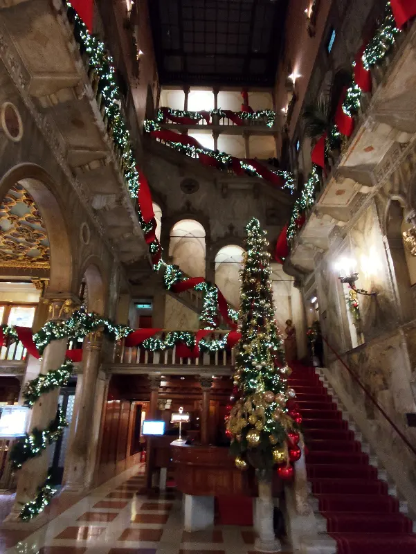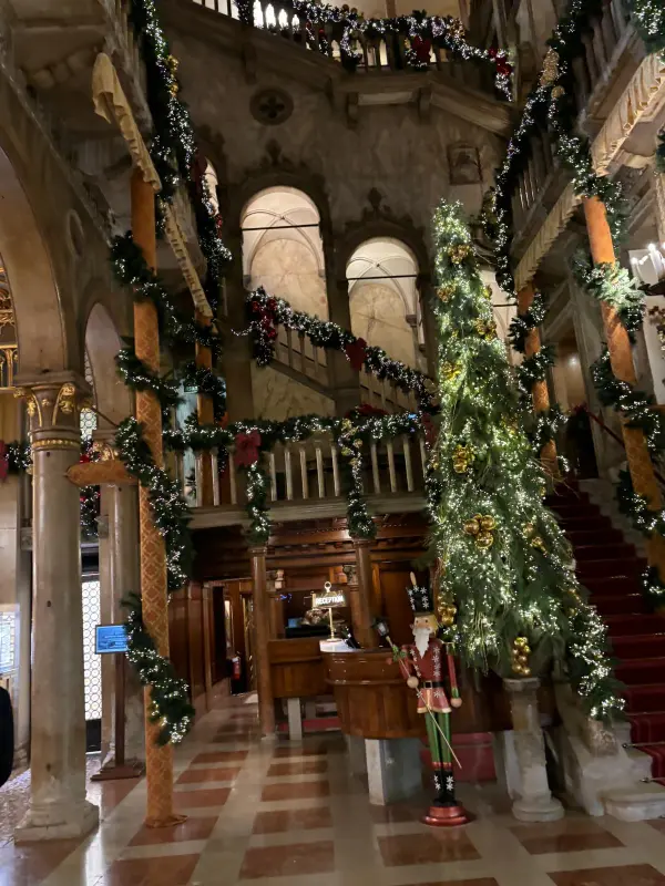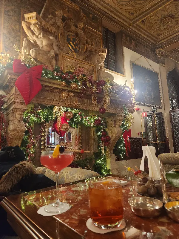 바 단돌로에 들어서는 순간, 탄성이 절로 나왔다. 높은 천장과 웅장한 계단, 화려한 장식들이 눈을 사로잡았다. 특히 크리스마스 시즌에 방문했을 때는 로비에 거대한 트리가 놓여 있었고, 계단 난간에는 아름다운 장식이 더해져 더욱 화려한 분위기를 자아냈다. 붉은 카펫이 깔린 계단을 따라 올라가면 마치 과거로 시간 여행을 떠나는 듯한 기분이 들었다.