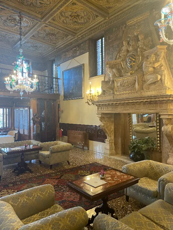 궁전의 역사를 고스란히 간직한 듯한 인테리어는 그 자체로 예술 작품이었다. 벽에는 섬세한 그림과 치장 벽토가 장식되어 있었고, 앤티크 가구들은 고풍스러운 분위기를 더했다. 샹들리에에서 쏟아지는 은은한 조명은 공간을 더욱 아늑하게 만들었다.