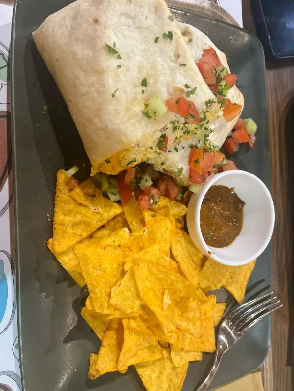 사진 속 랩은 신선한 야채와 소스가 조화롭게 어우러져 있습니다. 토마토, 양상추, 오이 등 다양한 야채들이 푸짐하게 들어가 있어 아삭아삭한 식감을 자랑합니다. 랩 안에 들어간 소스는 매콤하면서도 달콤한 맛을 내어 입맛을 돋우어 줍니다. 랩과 함께 제공된 나초는 바삭하고 짭짤하여 랩과 환상적인 궁합을 자랑합니다. Hum.Us에서는 이처럼 다양한 메뉴를 통해 고객들의 다양한 취향을 만족시키고 있습니다.