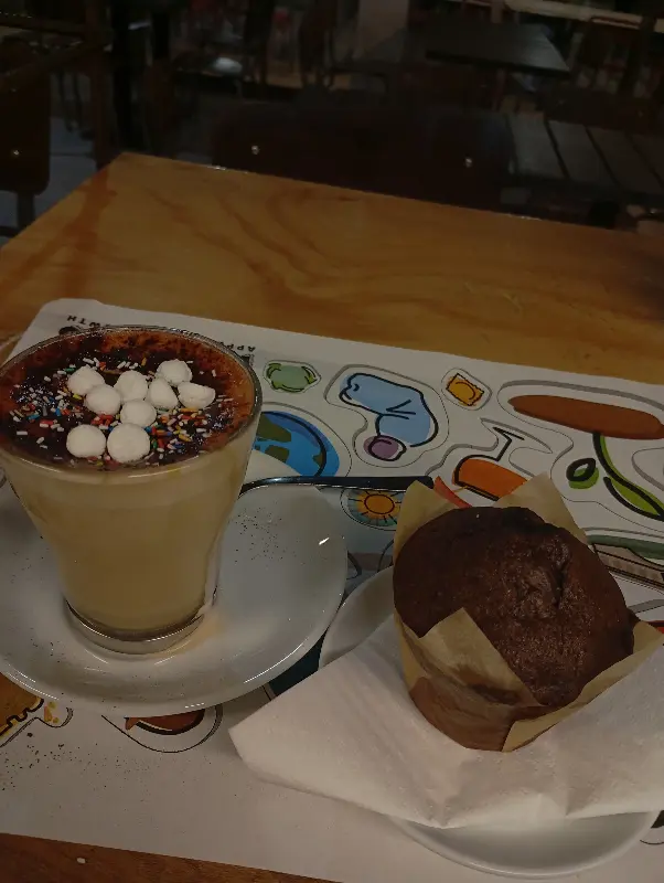 드디어 주문한 라떼와 머핀이 나왔습니다. 라떼 위에는 마시멜로우와 알록달록한 스프링클이 뿌려져 있어 보기만 해도 기분이 좋아졌습니다. 머핀은 따뜻하게 데워져 나와 촉촉하고 부드러웠습니다. 라떼를 한 모금 마시니, 부드러운 우유와 진한 커피의 향이 입 안 가득 퍼졌습니다. 달콤한 머핀과 함께 즐기니, 그 맛이 더욱 환상적이었습니다.