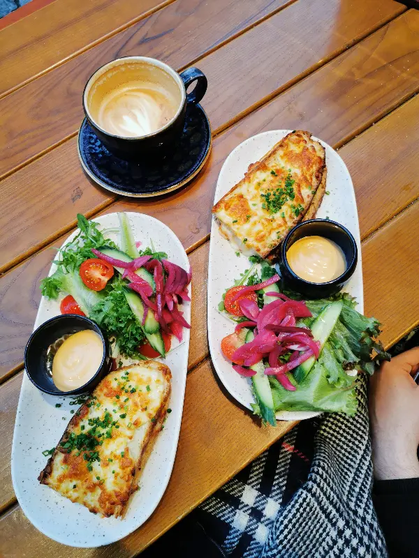 Fløien Folkerestaurant의 브런치 메뉴는 하나하나가 예술 작품과 같습니다. 특히, 가장 인기가 많다는 브런치 샌드위치는 보기만 해도 군침이 돌았습니다. 빵은 직접 만든다고 하는데, 겉은 바삭하고 속은 촉촉한 완벽한 식감을 자랑했습니다.