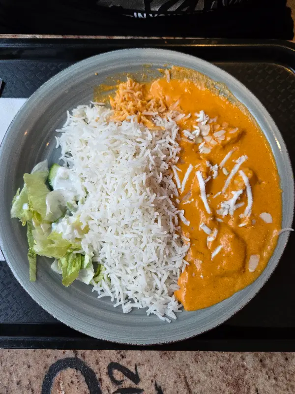 윤기가 흐르는 버터 치킨 커리와 고슬고슬한 밥, 그리고 신선한 샐러드의 조화가 완벽하다.
