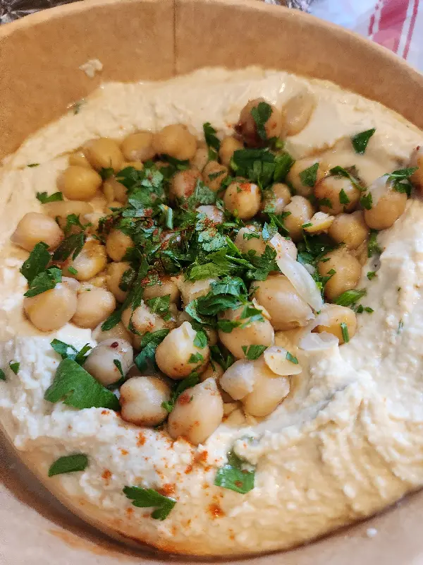 사진 속 후무스는 부드러운 질감과 고소한 맛이 일품입니다. 병아리콩과 신선한 허브가 듬뿍 올라가 있어 풍성한 식감을 자랑합니다. 올리브 오일을 살짝 뿌려 먹으면 더욱 깊은 풍미를 느낄 수 있습니다. 이처럼 아낌없이 제공되는 재료들은 아잠 레스토랑의 푸짐한 인심을 엿볼 수 있는 대목입니다.